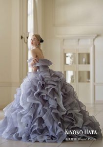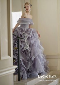 チュールとグリッタチュールの異素材の組み合わせと、幾重にも重なるフリルが立体感のあるドレス