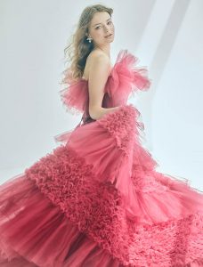 ビスチェに共生地のフリルを足すことで上半身も華やかに見せるアレンジも可能